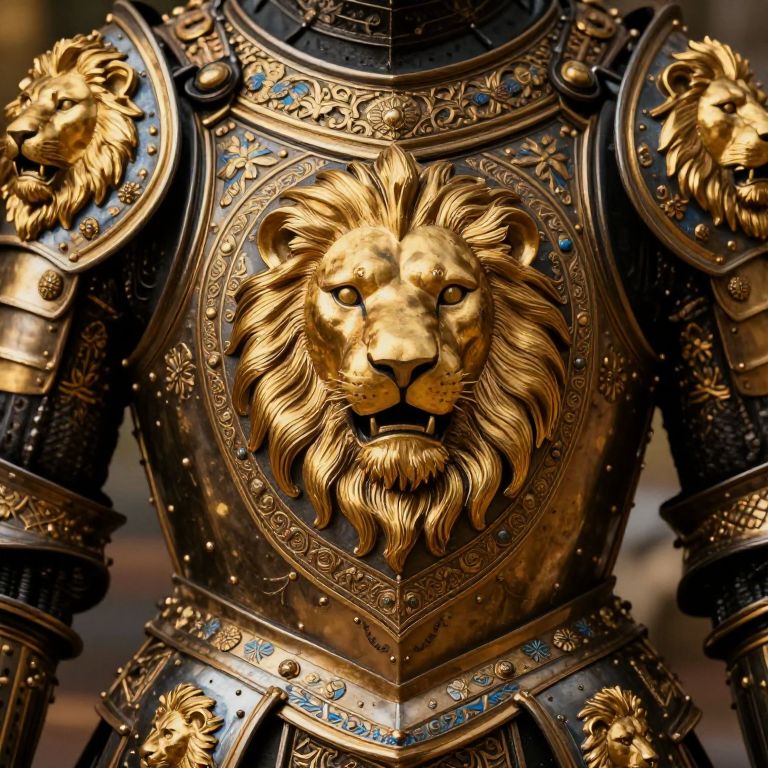 The image showcases a magnificent piece of armor adorned with intricate designs and embellishments. The armor is primarily composed of gold and black materials, creating a striking contrast. At the center, a large, ornate lion's head is prominently displayed, surrounded by a series of smaller lion heads arranged in a symmetrical pattern. The lion's head features detailed textures and patterns, including a fierce expression and intricate mane. Surrounding the lion's head are various decorative elements, such as floral motifs and geometric shapes, all intricately crafted and painted in shades of gold and blue. The armor's surface is textured, with raised elements that add depth and dimension to the overall design. The armor appears to be part of a larger ensemble, with the visible sections suggesting a full suit of armor. The craftsmanship is meticulous, with attention to detail evident in the precise placement of each element and the seamless integration of the various components. The overall composition is balanced and harmonious, with the central lion's head serving as the focal point, drawing the viewer's eye through the intricate patterns and textures.