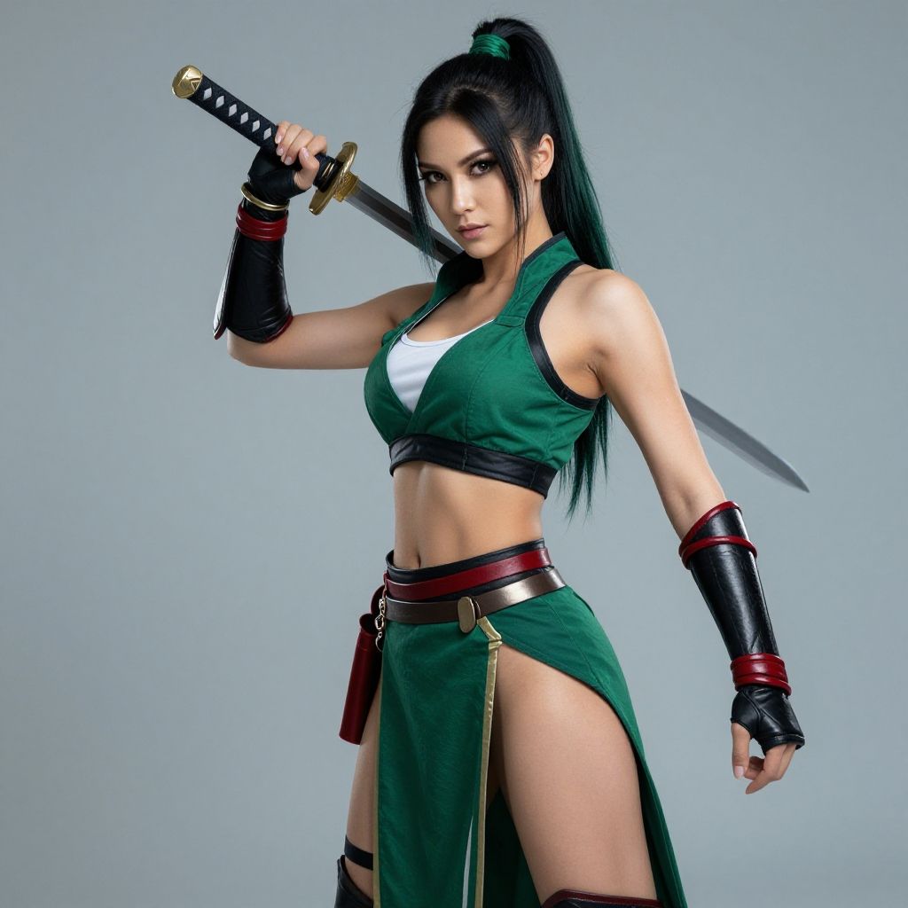 Digital artwork of a fierce, muscular Asian woman with long black hair in a ponytail, wearing a green martial arts outfit, holding a katana,