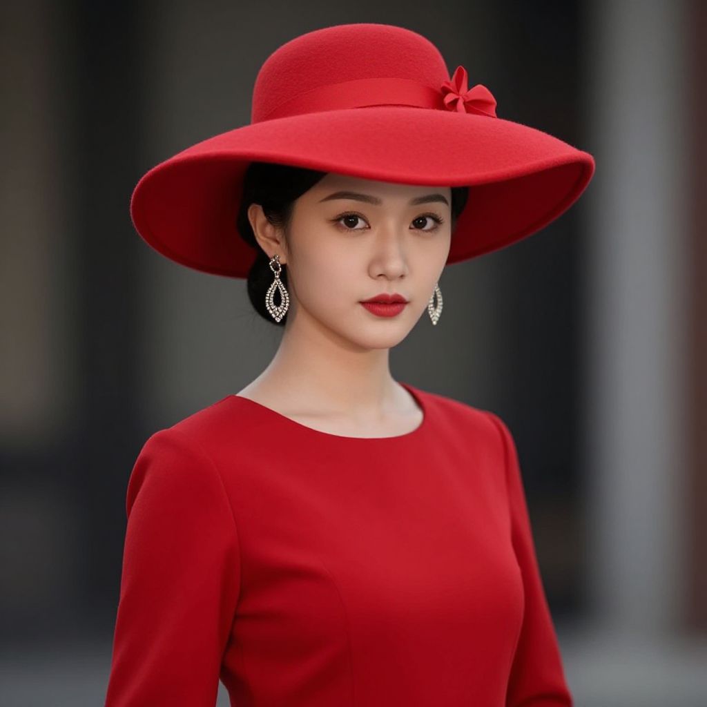 Bulma red dress costume, 1girl, solo, hat, black hair, earrings, jewelry, realistic, dress, asian, looking at viewer, red headwear