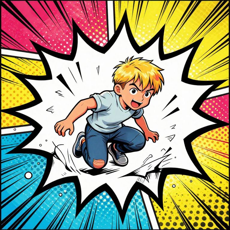 A vibrant, digital comic-style drawing features a young boy with short, blond hair and fair skin, dressed in a white t-shirt, blue pants, and gray sneakers. He is leaping into the air with a surprised, open-mouthed expression. The background is dynamic, with bold, colorful, and patterned explosion effects in red, yellow, blue, and pink. The white burst behind him emphasizes his motion. The image uses thick black outlines and dotted textures, typical of manga art, creating a sense of action and energy.