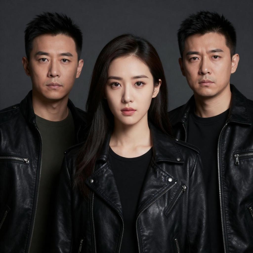 Photograph of four people standing against a blue, radial gradient background with technical symbols. Central woman with long dark hair, green and white patterned shirt, and gray cardigan, serious expression. To her left, man in black tie and white shirt, neutral expression. To her right, man in blue denim jacket, dark shirt, holding binoculars, intense expression. Far left, man in black shirt and sunglasses, relaxed expression. All standing, facing forward.