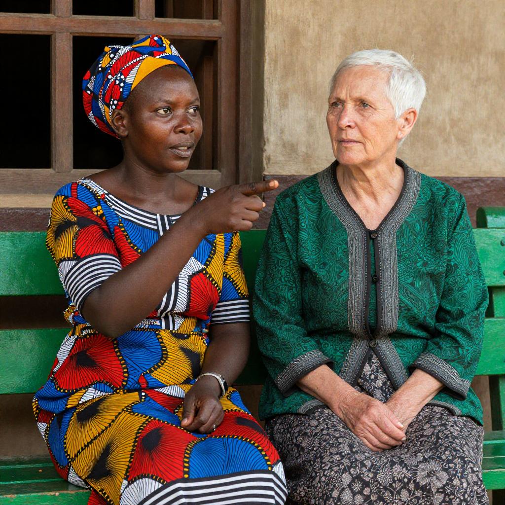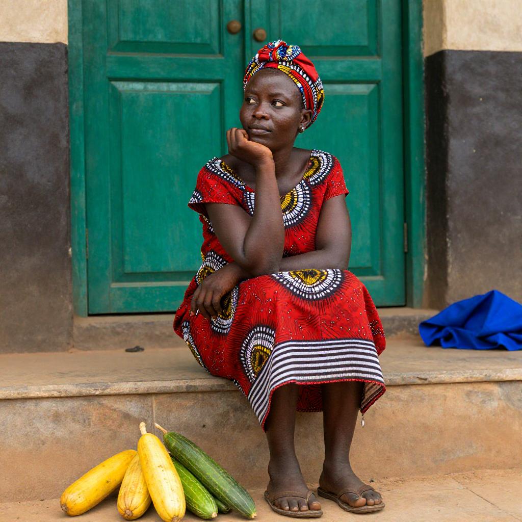 African woman with dark skin, wearing a red, patterned dress and headwrap, sitting on a stone step, hand to chin. Green door and dusty ground in background. Yellow and green vegetables on the step. Blue cloth in background.
