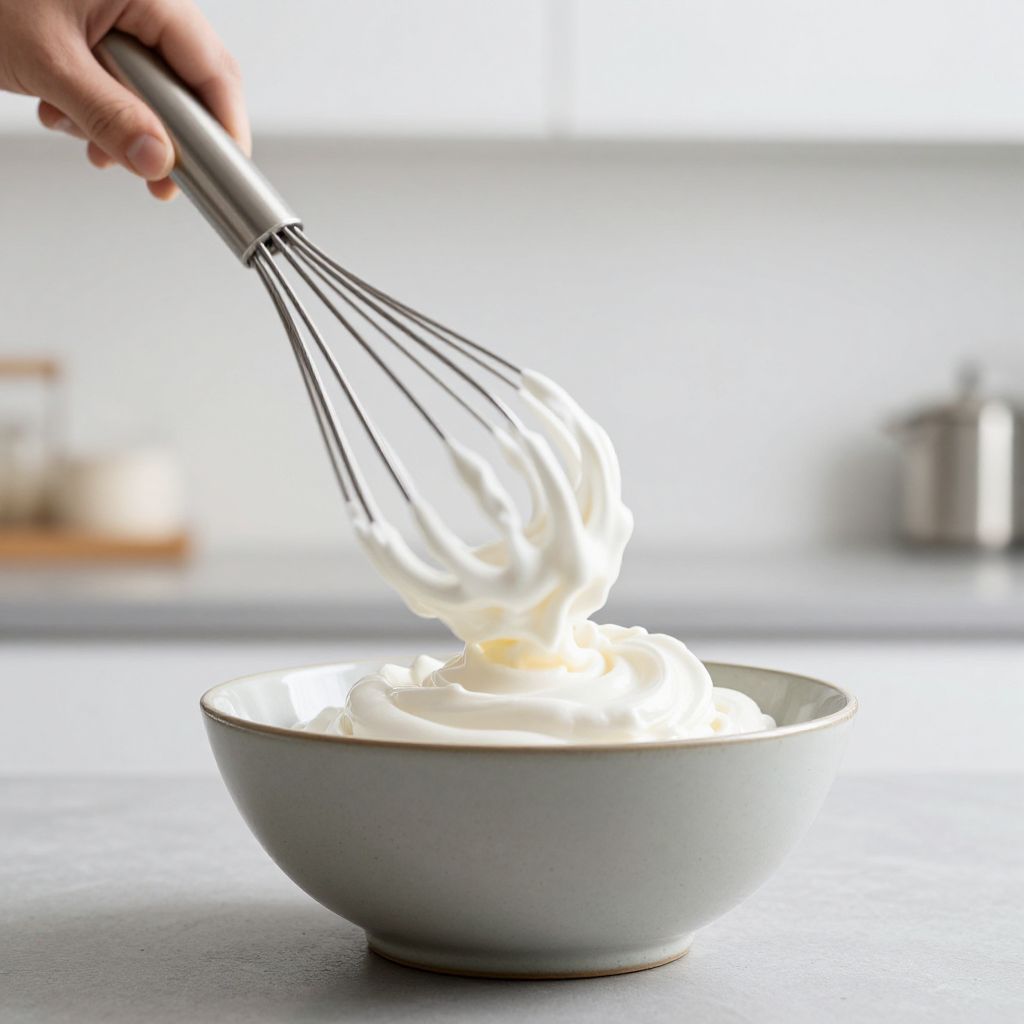 Photograph of a hand holding a whisk, pouring thick white whipped cream into a gray ceramic bowl on a sleek kitchen counter.