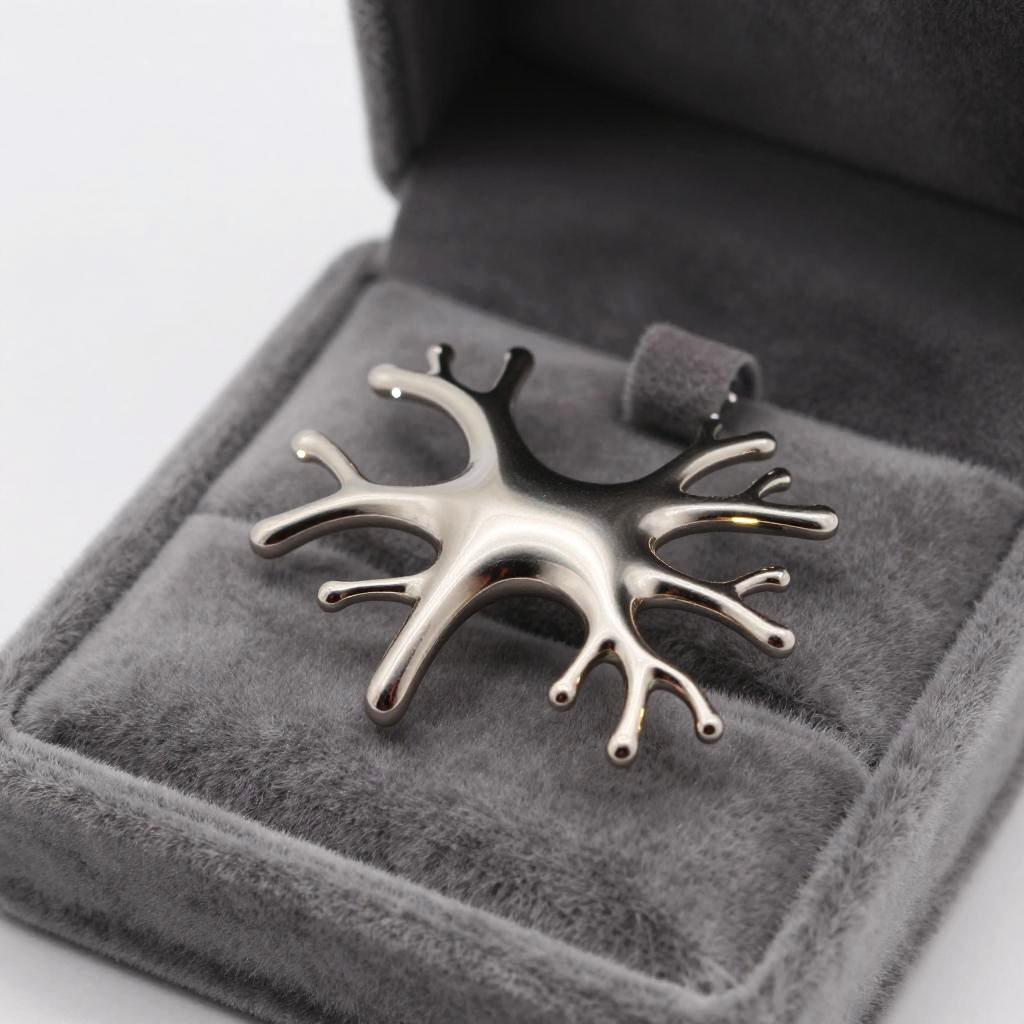 AI jewelry with sculptural forms resembling neural networks, crafted from polished titanium and illuminated with subtle LED highlights, presented in an elegant open box with velvet interior, emphasizing the blend of technology and craftsmanship.