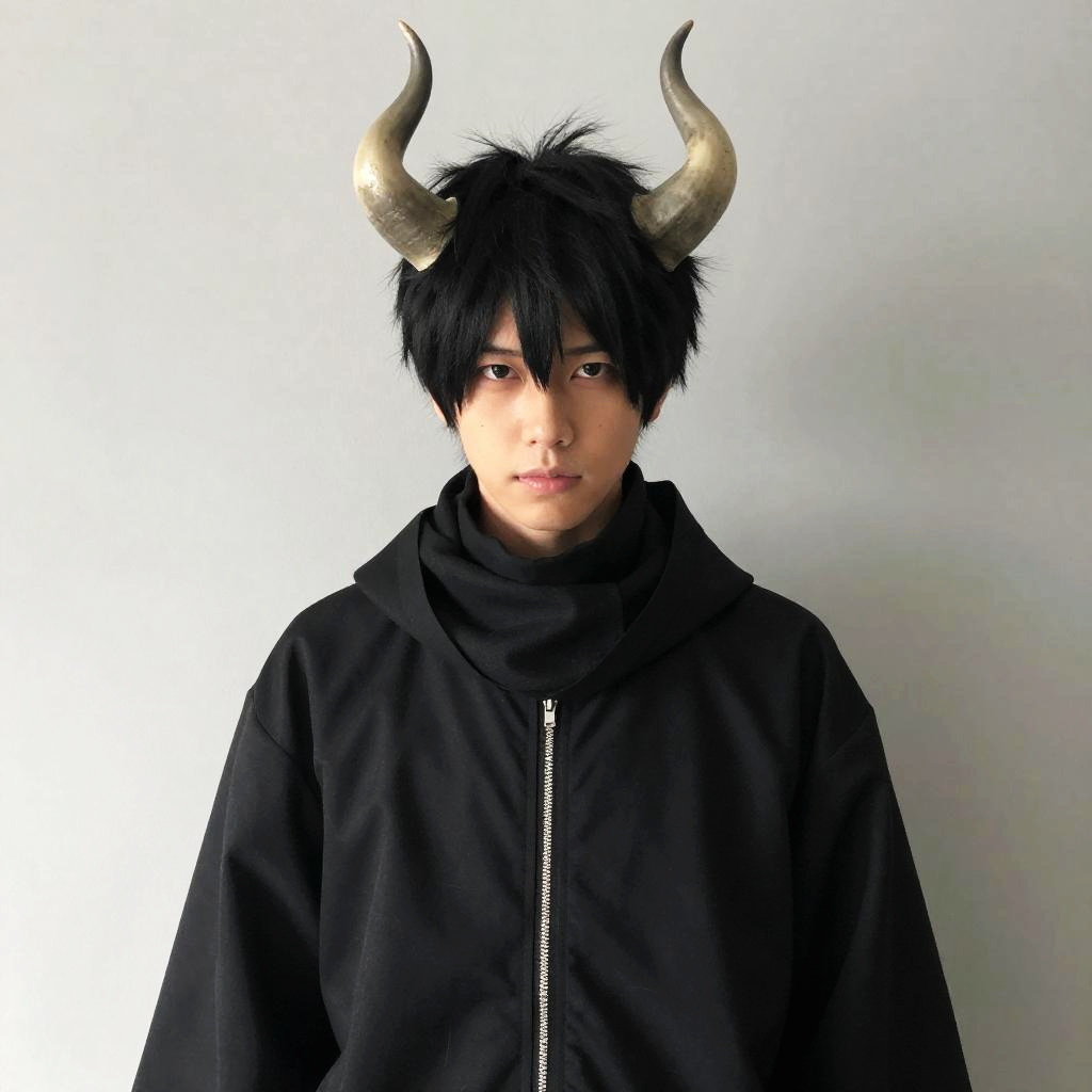 Akira Apocalypse Costume, male in a black outfit with horns and a scarf