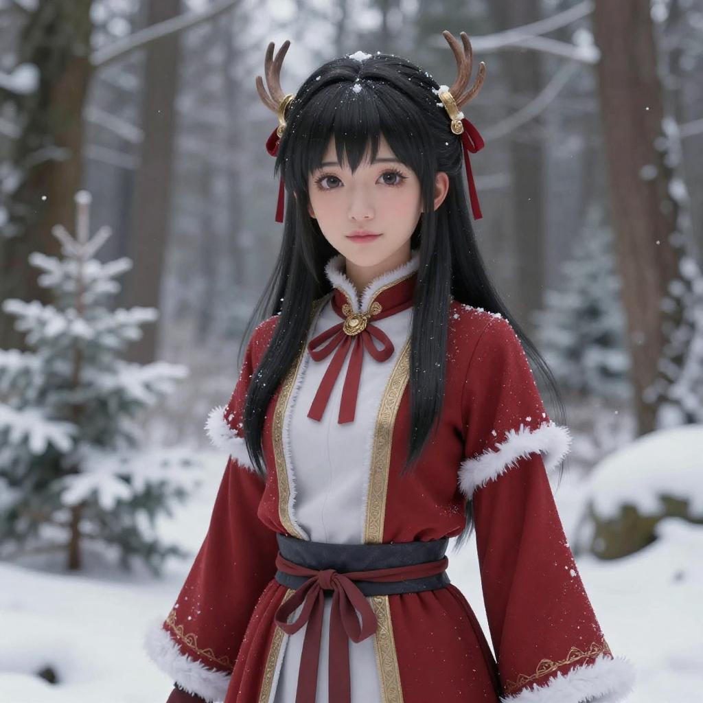 Photograph of a young Asian woman with long black hair and fair skin standing in a snowy forest. She wears a festive, red and white, fur-trimmed winter dress with gold accents, a red ribbon at the neckline, and a black belt. Her head is adorned with small, brown antler-like hairpieces and red ribbons. The background features snow-covered trees, adding a wintry atmosphere. Her expression is gentle, and she looks directly at the camera. The image has a soft, slightly blurred effect, enhancing the serene, winter forest setting.