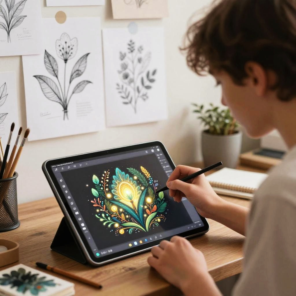 Draw with AI free: an imaginative scene of a young artist using a tablet with AI-assisted drawing software, creating intricate nature-inspired art with glowing elements, surrounded by floating botanical sketches and digital brushes in a cozy studio.