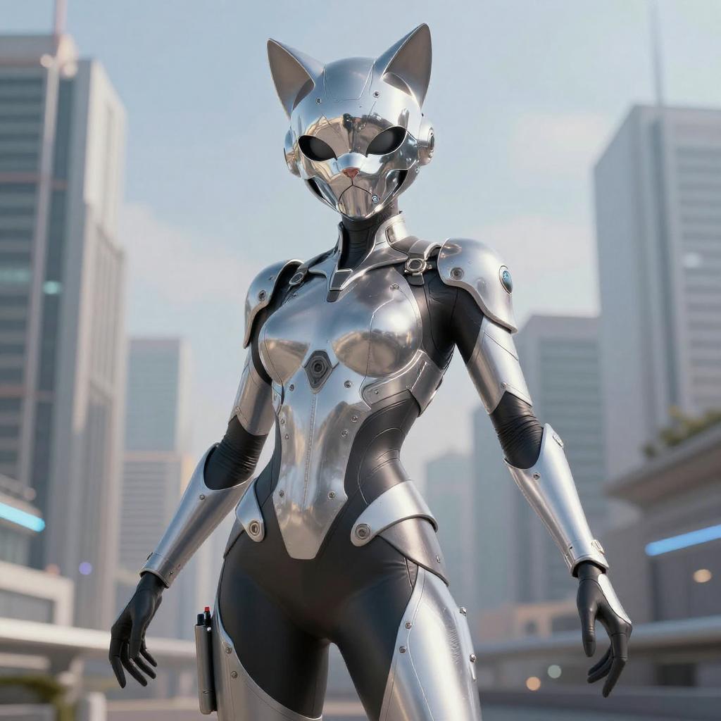 Cat girl mask futuristic, sleek armored suit, silver and black color scheme, reflective cat mask with glowing eyes, high-tech city skyline, dynamic pose, digital rendering