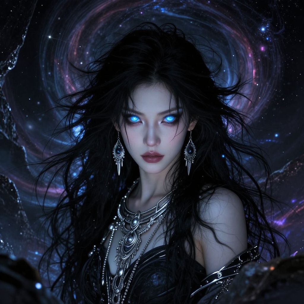 Digital artwork of a pale, ethereal woman with glowing blue eyes and long, wild black hair. She wears intricate silver jewelry, including large dangling earrings and a detailed necklace. Her dark, black, strapless top contrasts with her luminous eyes. The background features a swirling, cosmic pattern with nebulae and stars in shades of blue and purple. The overall composition is dark and mysterious, with a fantastical, otherworldly feel. The woman's intense gaze and the cosmic backdrop create a striking, mystical image.