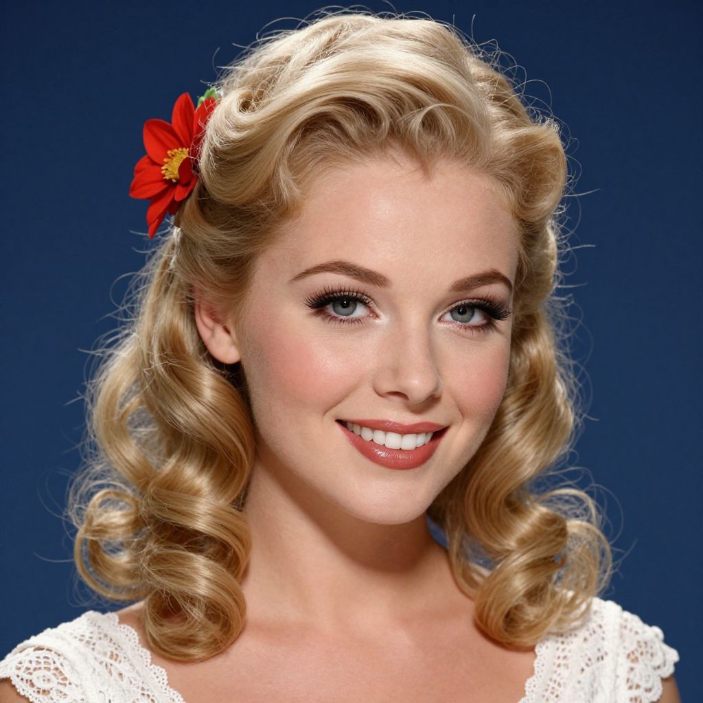 Digital portrait of a blonde, fair-skinned woman with red lipstick, curled hair, and golden background, evoking a classic Hollywood glamour style.