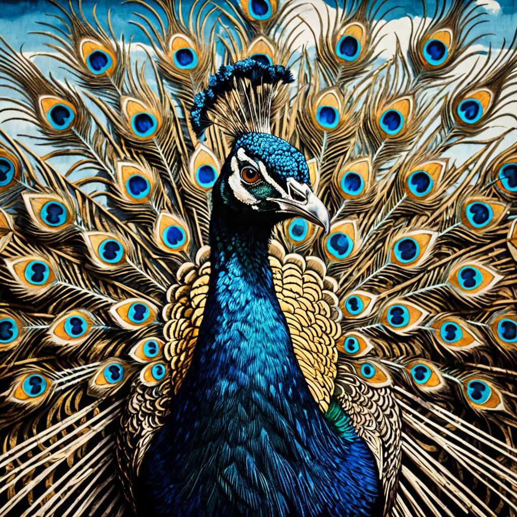 Peacock with a jeweled crown, rendered in mannerist style from 1500-1600, pale goldenrod color tone, detailed textures, warm lighting, classical painting influence