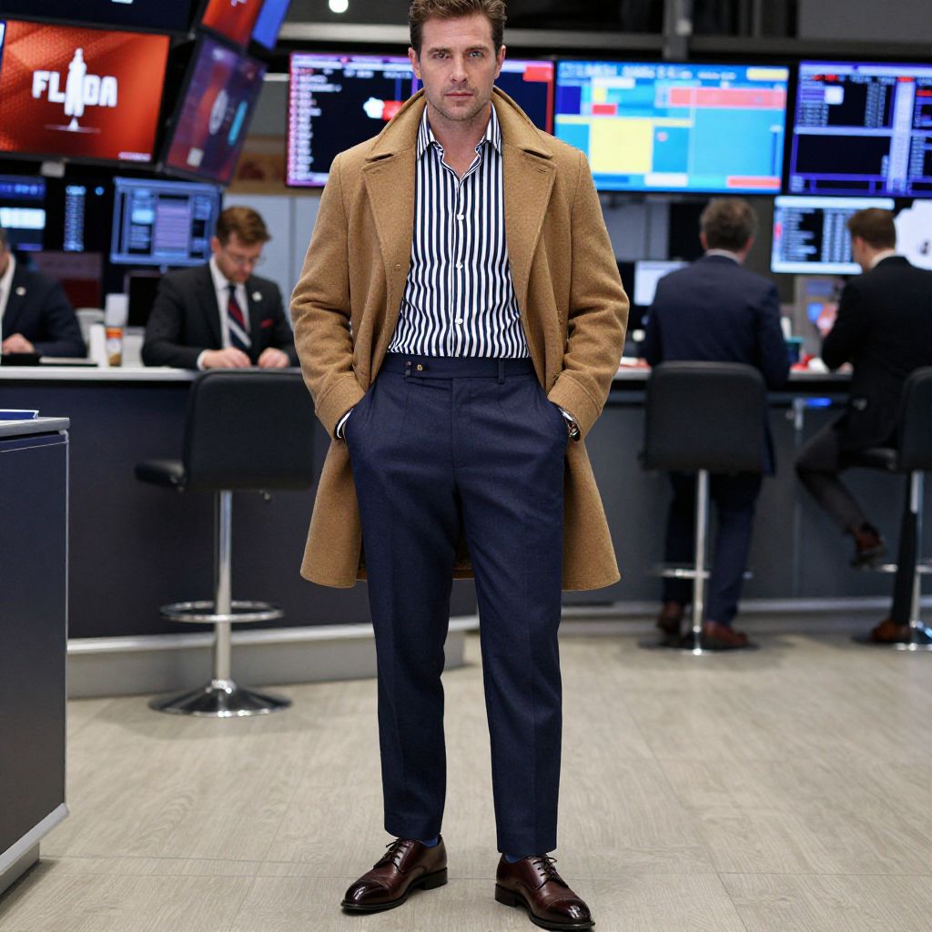 A man, camel peacoat, striped navy dress shirt, slate blue dress chinos, dark brown leather monk straps, sophisticated style, open trading floor, vibrant screens, intense focus, calotype process, confident expression. Man has masculine face and piercing eyes