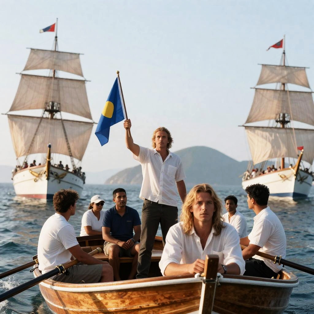 Photograph of several people in a small wooden boat with a man standing and holding a flag, surrounded by three larger sailing ships. Mountainous island in the background. People are diverse, some sitting, some standing, holding oars. Sunlight creates a warm glow. Flags on ships and boat. Man in the foreground has long blonde hair, white shirt, intense expression.
