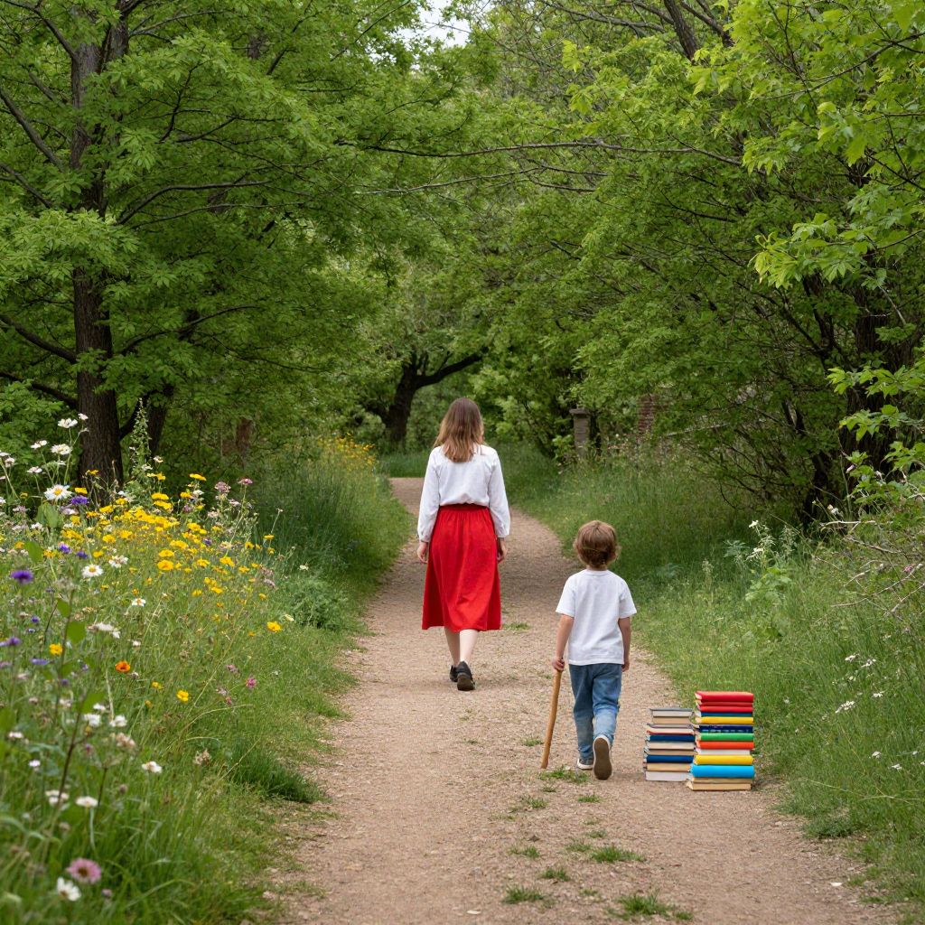 Lush green trees flank a winding dirt path where a woman in a red skirt walks toward a child carrying a wooden stick, surrounded by vibrant wildflowers and stacks of colorful books resting on the ground, evoking a whimsical scene where nature intertwines with imagination.