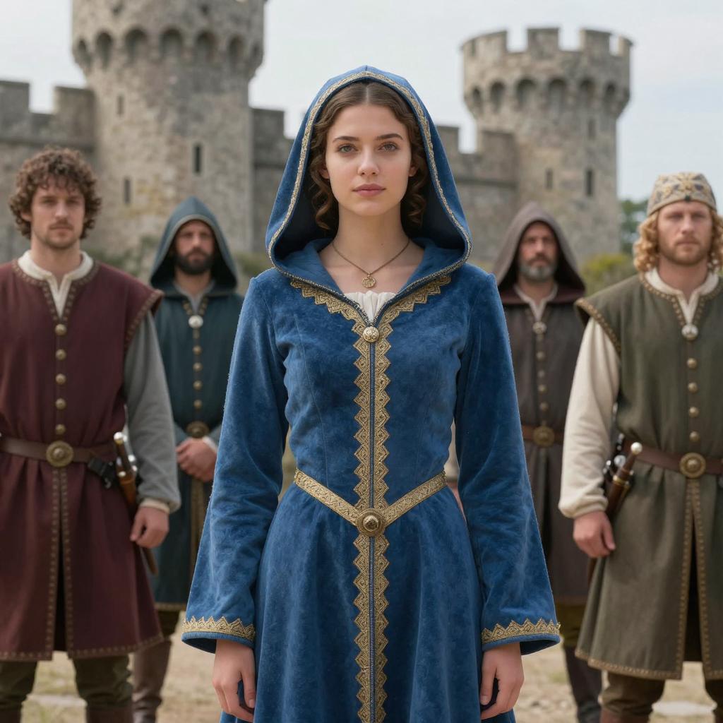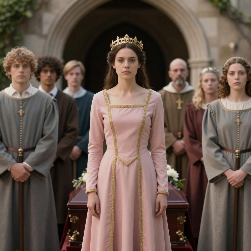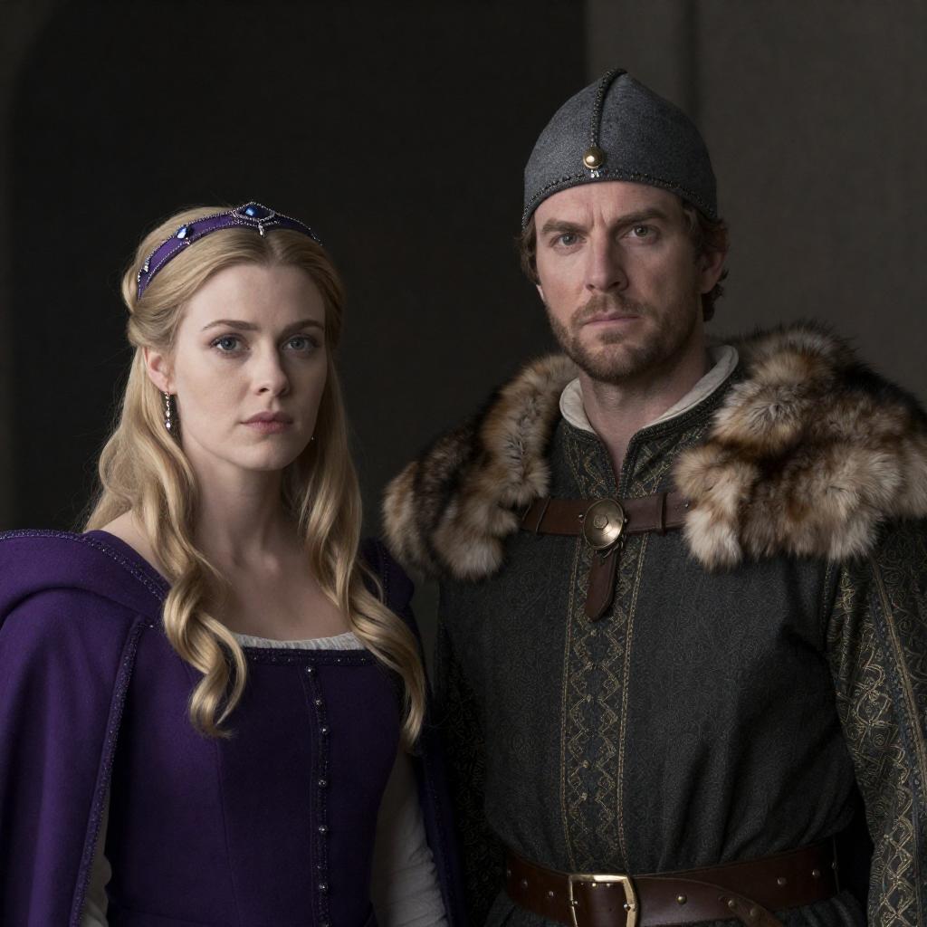 Photograph of a royal court. A young woman with wavy brown hair and a silver crown stands beside a man in a blue, ornate, medieval-style robe with a gold headpiece. Four men in green and brown robes with silver embroidery stand behind them. Dimly lit background with a candle chandelier. The man on the right has a serious expression. The woman looks forward with a neutral expression.