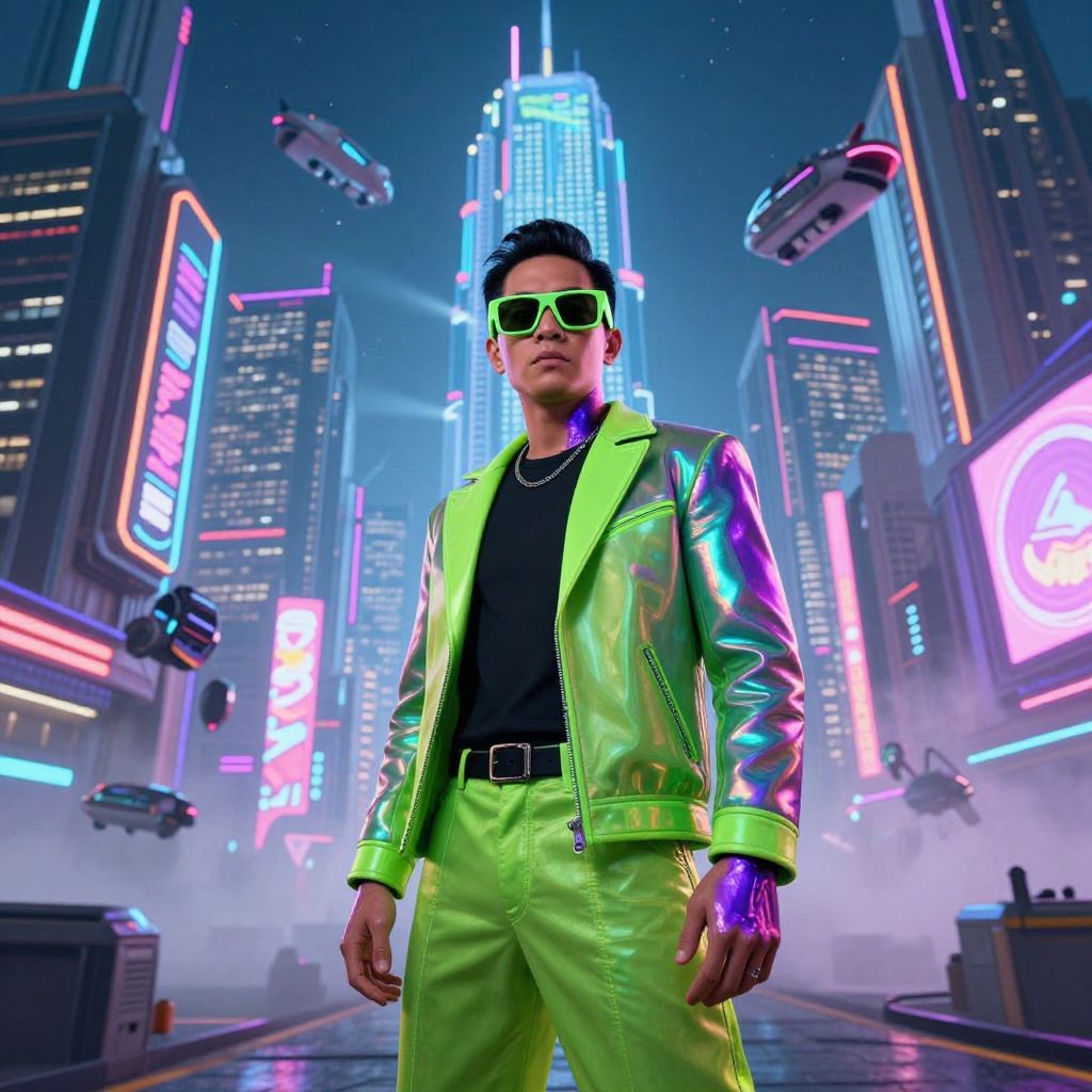 Neon-lit cyberpunk cityscape featuring a confident Asian man in a shiny green jacket, lime pants, green sunglasses, and black shirt. Hover