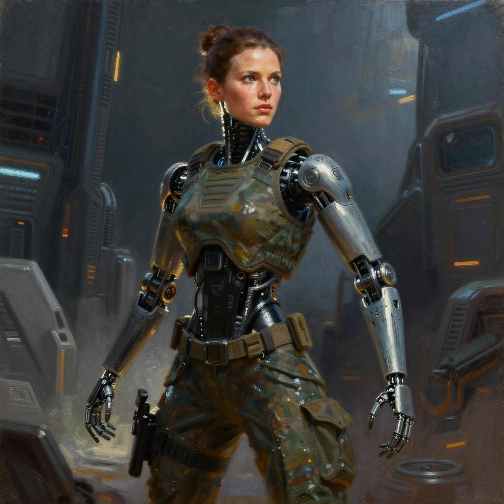An elderly woman in a futuristic cyberpunk outfit wanders through a neon-lit urban rooftop garden overlooking a sprawling metropolis, cinematic a blend of Syd Mead and Moebius inspired by Ridley Scott's cinematic visuals, epic fine-art painting, vibrant energy, dynamic lighting, scattered yellow mushrooms.