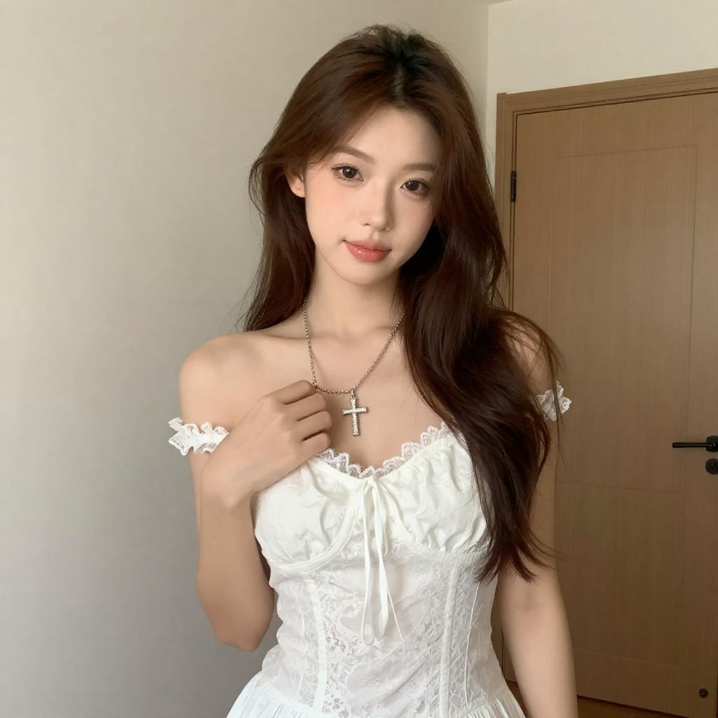 Photograph of a young woman with long, wavy brown hair and light skin, wearing a white, off-shoulder lace dress with a corset-style bodice. She holds the dress's fabric, revealing a cross necklace. She stands in a softly lit room with a wooden door in the background.