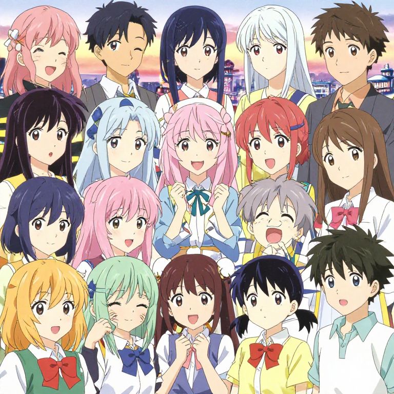 A detailed illustration of all anime art styles merging into one scene, highlighting exaggerated expressions, bold outlines, soft pastels, and intricate backgrounds typical to the genre; anime characters in various styles interact in a fantasy cityscape at sunset.
