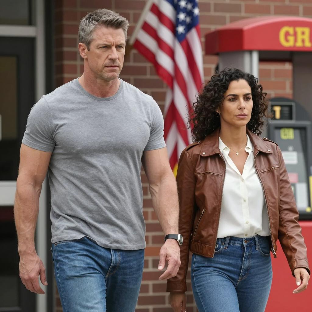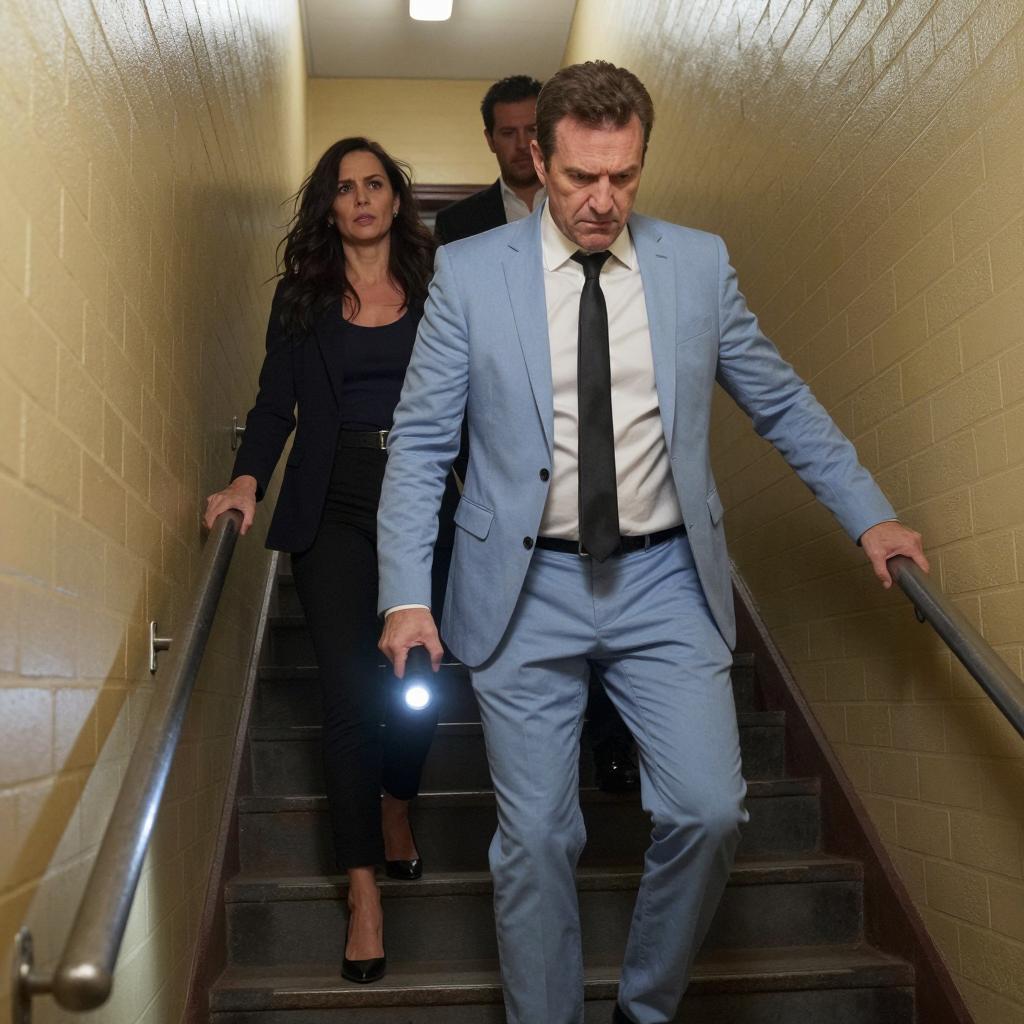 A middle-aged man in a light blue suit and black tie chases a woman with dark hair down a narrow, dimly lit staircase. He has a stern expression, while she looks back anxiously. The staircase has yellow brick walls and metal handrails. The man holds a flashlight in his right hand. Two people, intense facial expressions.