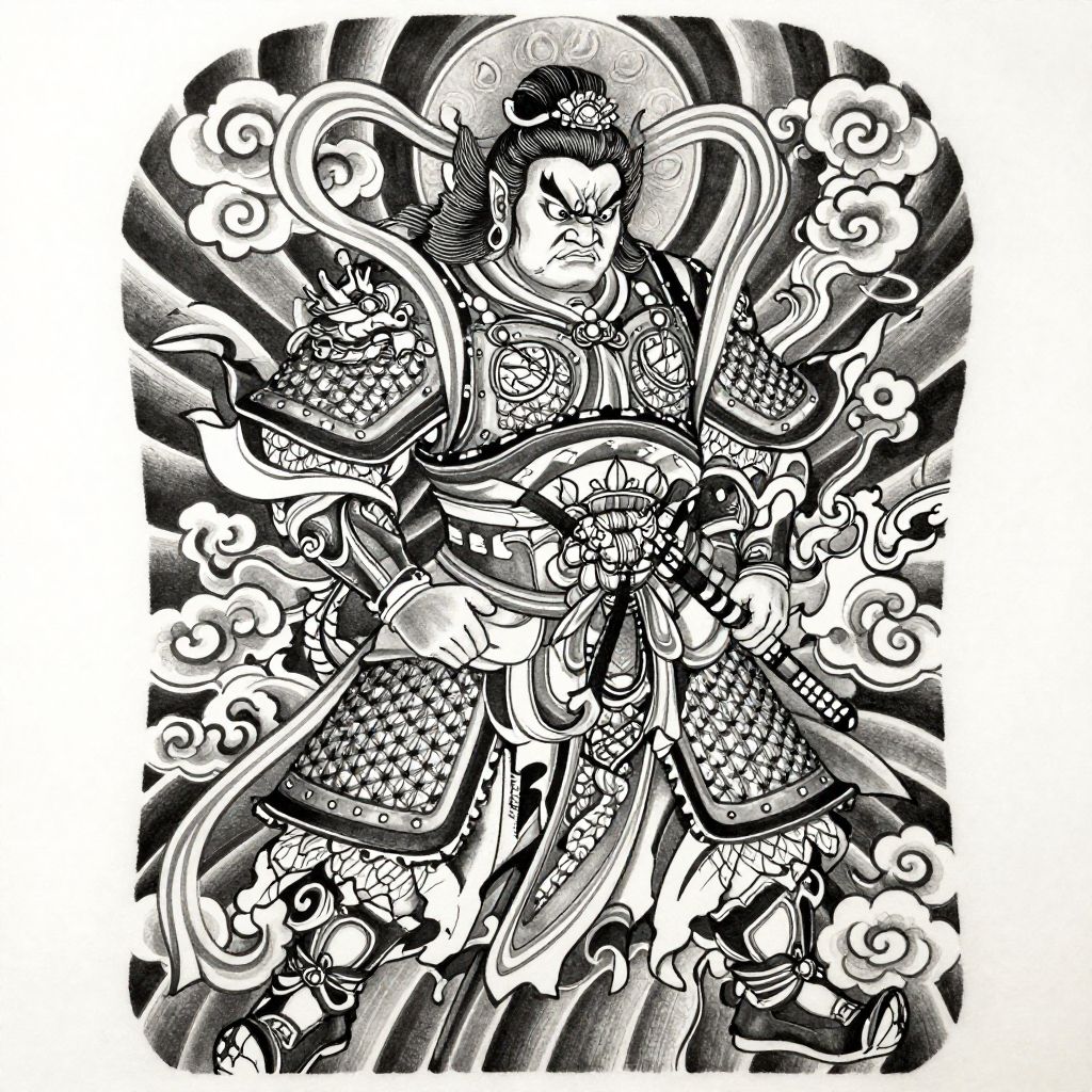 Warrior in Chinese tattoo style, intricate black ink design, fierce expression, traditional armor details, swirling clouds and dragons background, dynamic composition, high contrast shading