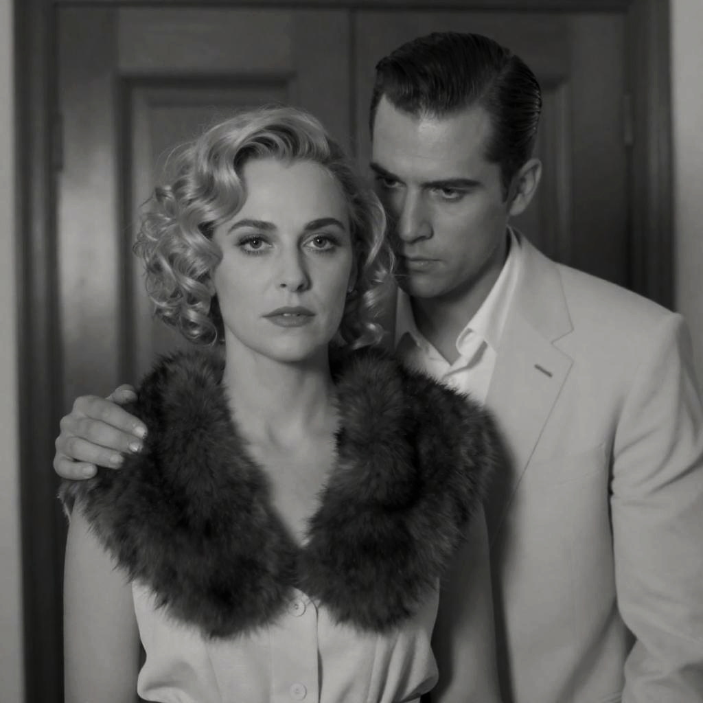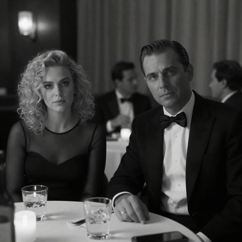 Black-and-white photograph of a bar scene. A woman with short, curly hair, wearing a button-up dress with a belt, stands with hands on the bar. A man in a cowboy hat and sunglasses pours from a bottle into a glass. Bar shelves with bottles and glasses in the background. Woman's expression is serious. Man's expression is focused.