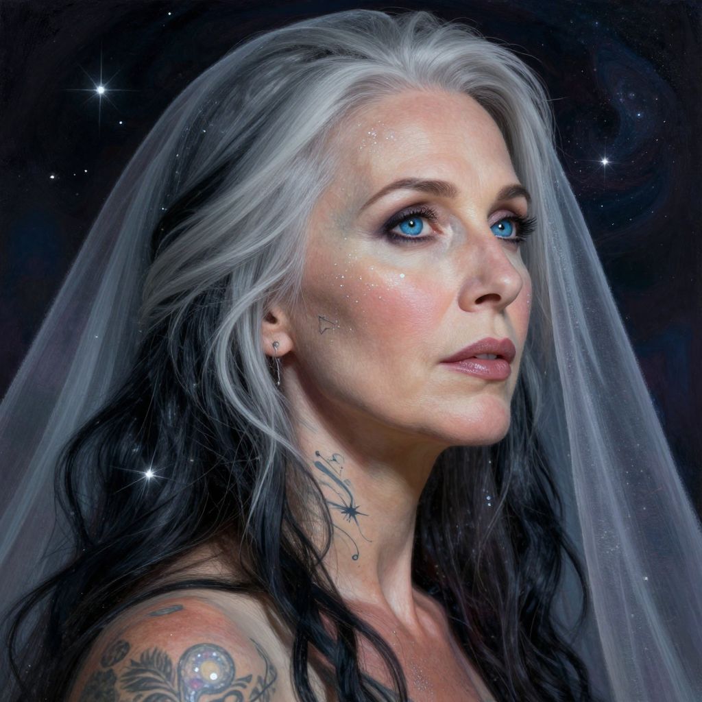 Digital portrait of a fair-skinned, blue-eyed woman with long silver-black hair, wearing a translucent veil, star tattoos, and a starry background