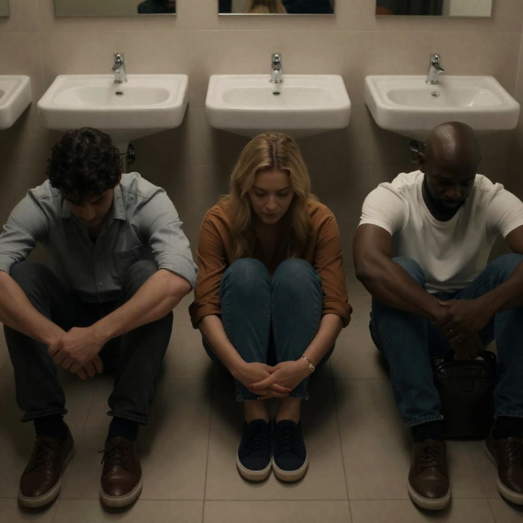 Photograph of three people sitting on a dimly lit tiled floor in a bathroom with six white sinks in the background. The person on the left is a dark-haired man in a gray shirt and pants, head down, hands on knees. The person in the center is a blonde woman with a brown shirt and blue jeans, knees up, hands on the floor, looking down. The person on the right is a bald black man in a white shirt and jeans, holding a dark bag, looking down. Sinks have illuminated lights.