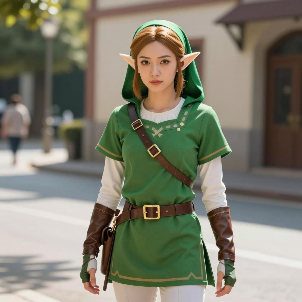 Zelda woman costume, photorealistic cosplay, young woman, brown-haired, green hooded tunic, brown leather straps, white pants, leather bracers, outdoors, sunny day, blurred background, trees, building, street, soft shadows, focused on character, realistic lighting, high detail, realistic ures, confident expression, vibrant colors, digital art, SD/T2I model