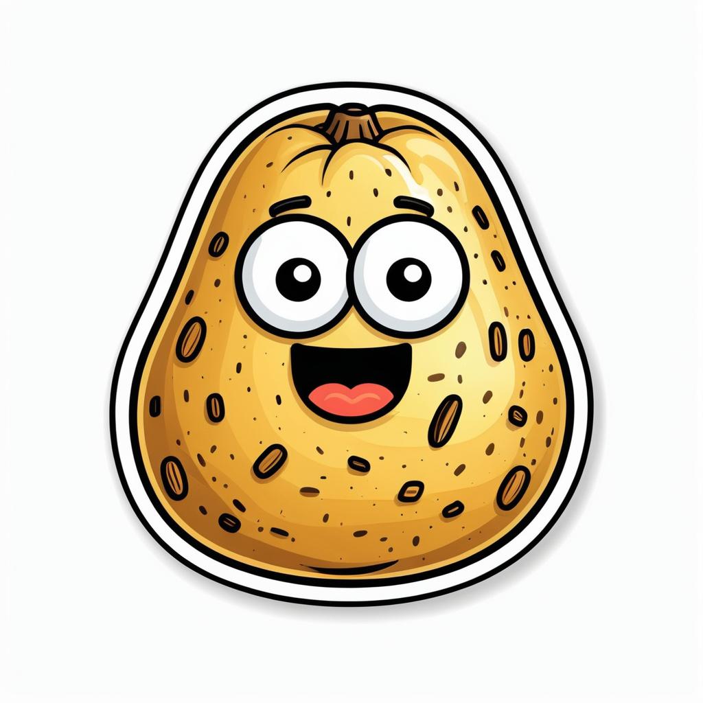 Illustration of a happy cartoon potato character with big round eyes and a smiling mouth, designed as a sticker or logo on a white background. The potato has a light brown skin with dark spots and a small stem on top, giving it a cute and friendly appearance.