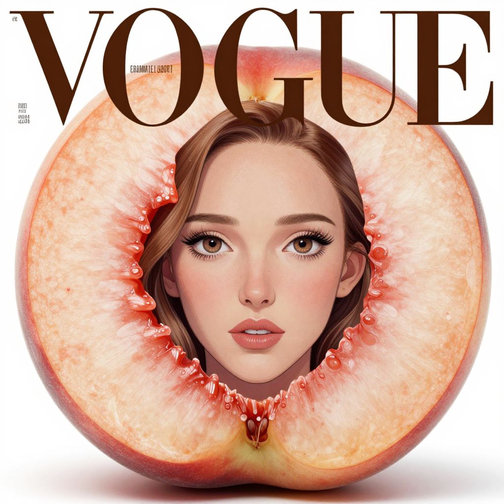 Vogue magazine, elle magazine, inside a large fruit half peach, anime korean natalie portman face, ilya kuvshinov, greg rutkowski, john singer sargent, anime, trending on artstation, intricate