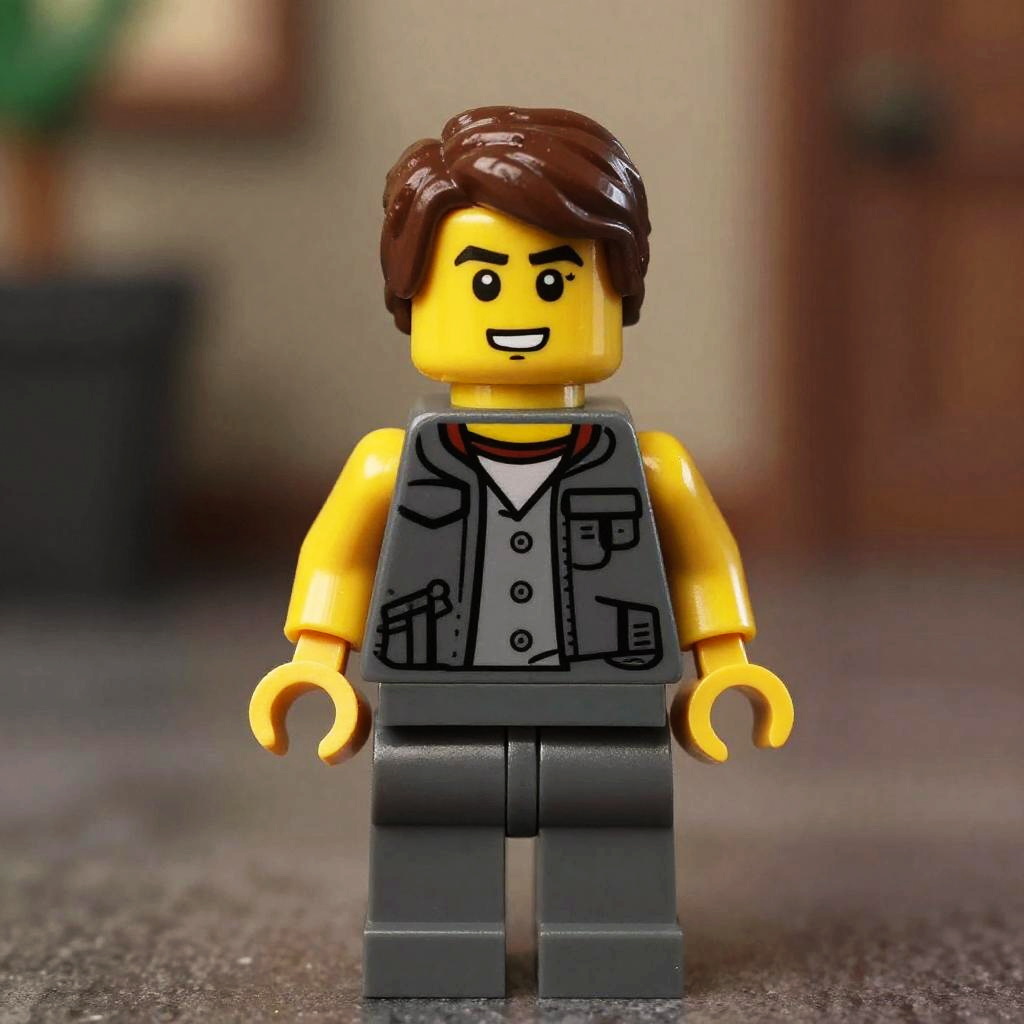 Rick Grimes LEGO figure from The Walking Dead. Rendered in mini figure LEGO style with a vintage aesthetic.