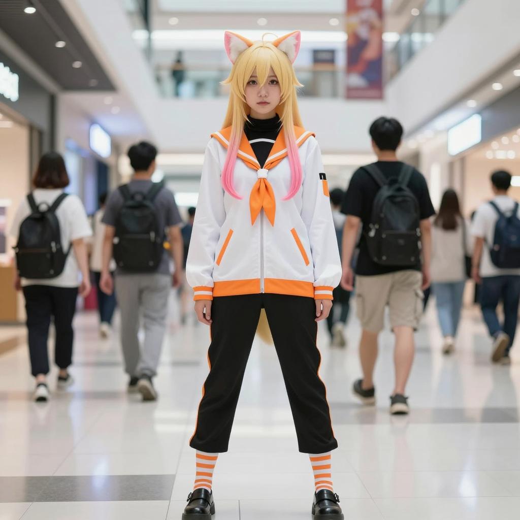 Plus lucky beer girl costume, photorealistic, cosplay, female, long brown hair, braided, wearing yellow and green outfit, "EWL" on chest, short skirt, black underwear, hat with ribbon, holding glass of beer, standing in outdoor market, orange lanterns in background, daytime, people walking in background, casual setting, natural light, cheerful expression, knee-high black boots, festive atmosphere
