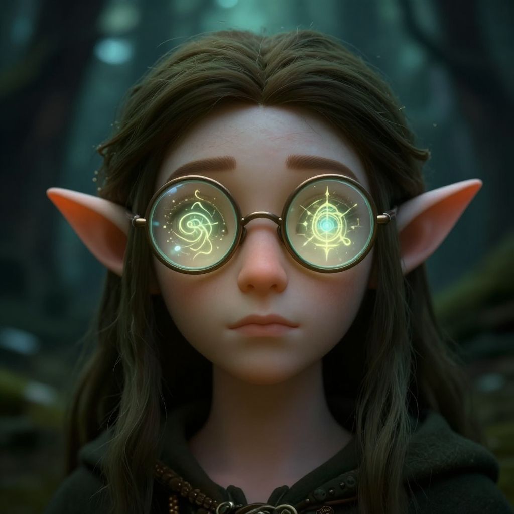 Avatar with glasses, fantasy theme, elf with intricate round glasses, magical runes glowing on lenses, mystical forest background, dramatic lighting, concept art