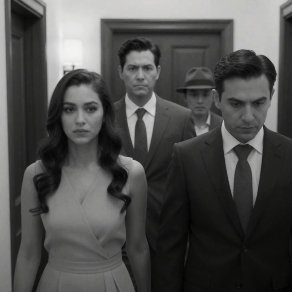 Black-and-white photograph featuring three adults in a formal and intense conversation. Woman on the left has curly hair, large hoop earrings, and wears a fur coat, facing two men. The man in the center has slicked-back hair, a neutral expression, dressed in a suit and tie. The man on the right wears a dark headband and blazer, leaning in with a serious expression. The background includes a subtle vertical striped pattern.