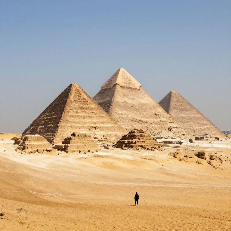Photograph of the Giza Pyramids under a clear blue sky. Three large, ancient pyramids with weathered, brownish stone surfaces dominate the background. The largest pyramid is in the center, with a slightly smaller pyramid to its right and a smaller one to the left. The foreground features a vast, sandy desert with a single, small, dark silhouette of a person standing near the bottom center, adding scale to the massive pyramids. The sandy ground has a textured, rippled appearance. The image captures the grandeur and scale of the pyramids against the bright, empty sky.
