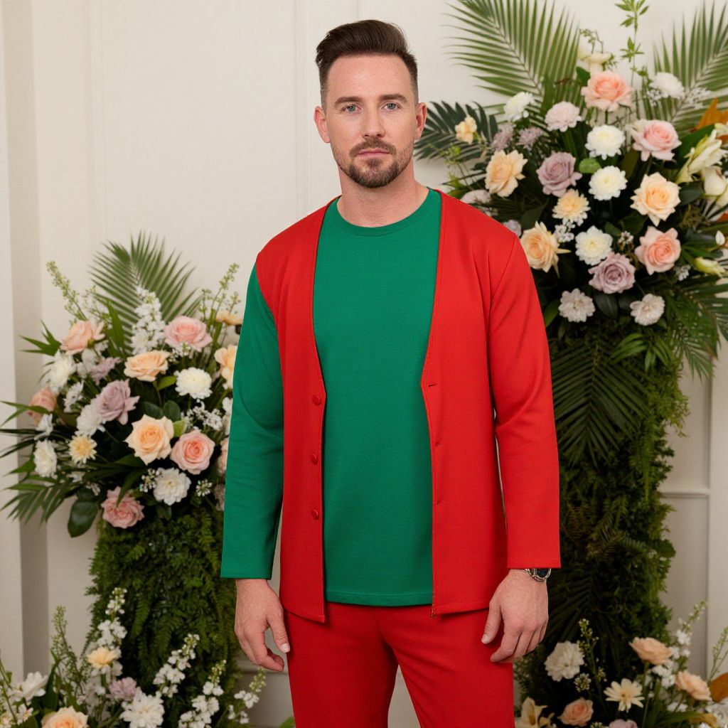 Photograph of a Caucasian man with a trimmed beard and dark, styled hair. He wears a bright green t-shirt under a red blazer and matching red pants. He has a medium build and stands against a backdrop of lush greenery and a large floral arrangement featuring pale pink, white, and peach roses. The background is softly lit, highlighting the vivid colors of his outfit and the delicate flowers. The man's expression is neutral, and he stands slightly to the right of the center. The overall style is modern and vibrant.