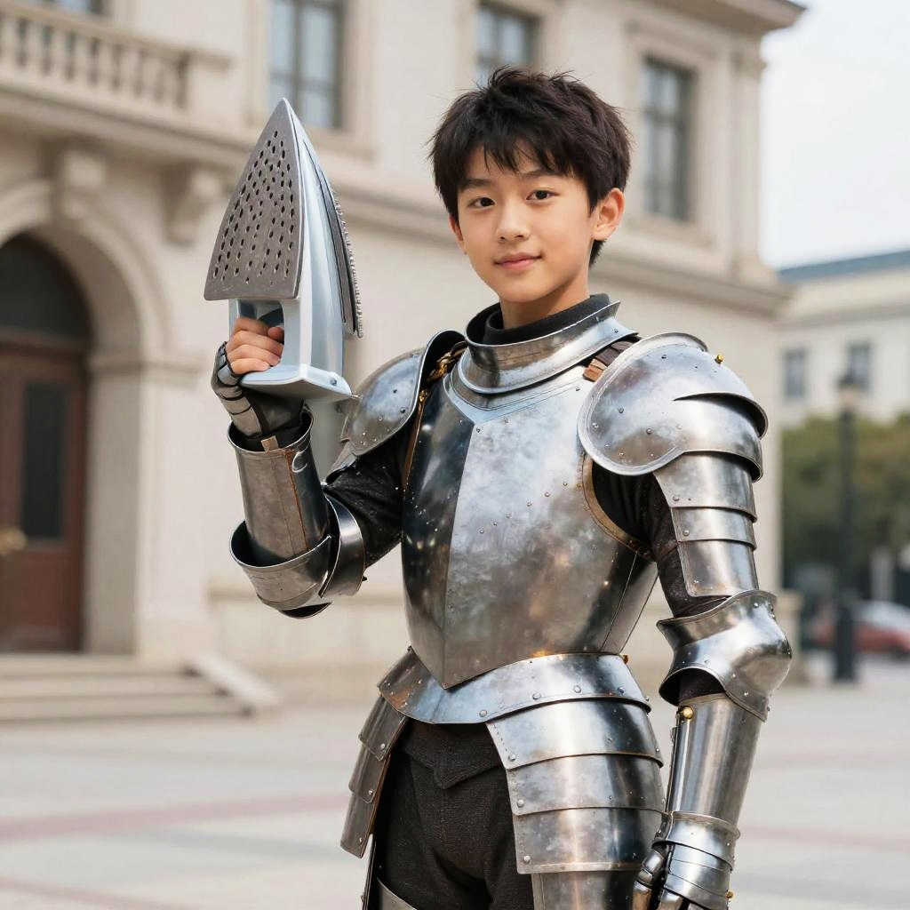 Boy in Armor Posing by Building
