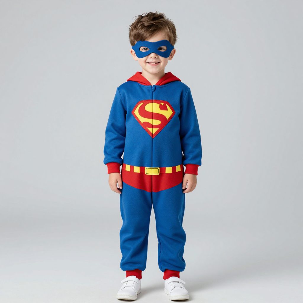 Superhero Onesie Costume, boy in a blue and red costume with a mask