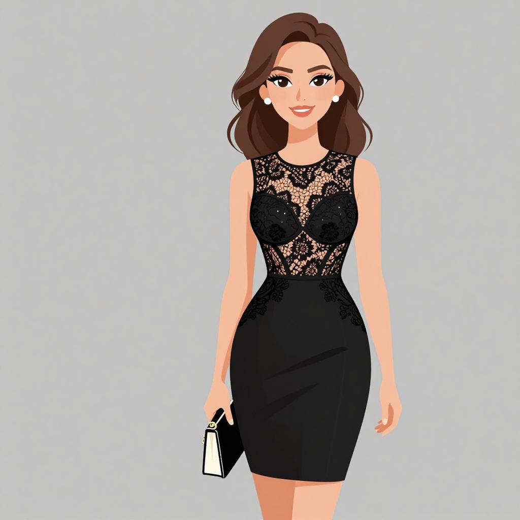 Digital illustration of a smiling woman with long brown hair, wearing a sleeveless black lace dress and holding a black clutch, against a light blue background.