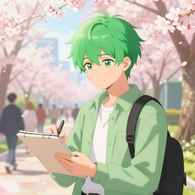 Cool green anime boy with tousled vibrant green hair, in a bustling city park during springtime, surrounded by cherry blossoms blowing in the breeze, modern casual clothes, holding a sketchbook and pen, soft pastel color palette, warm sunlight, slice-of-life anime aesthetic.