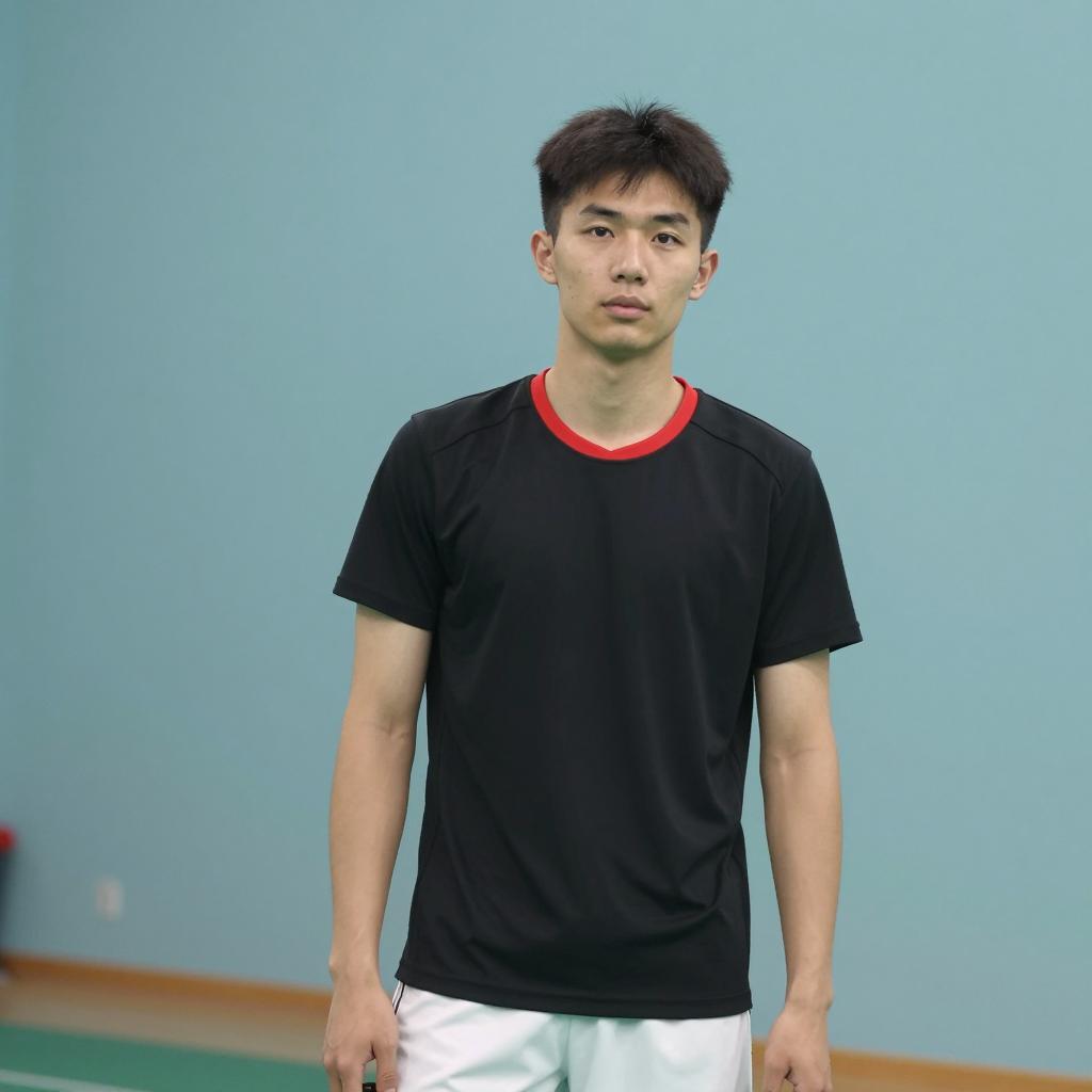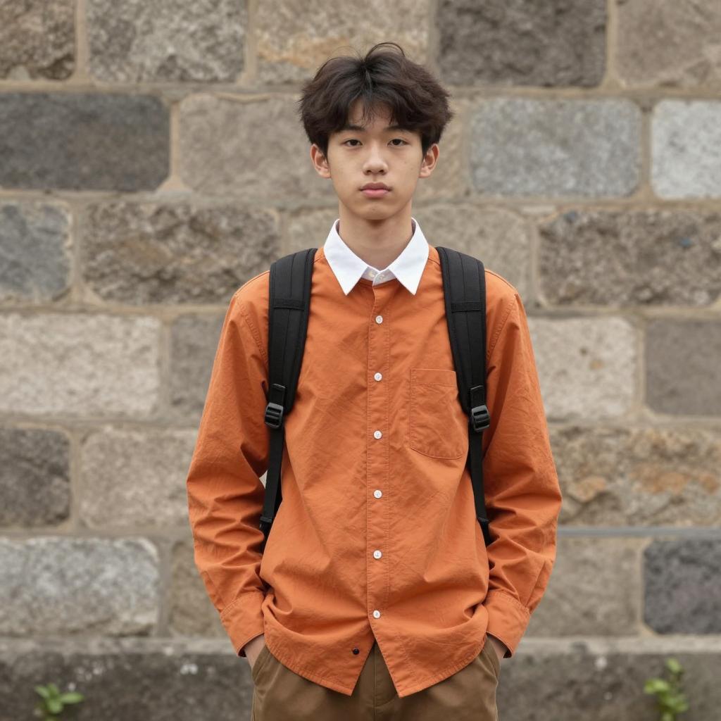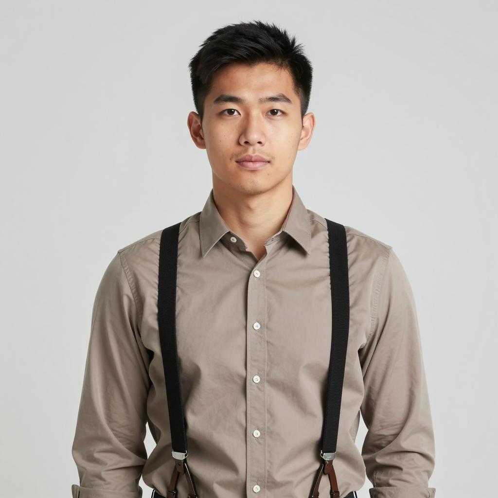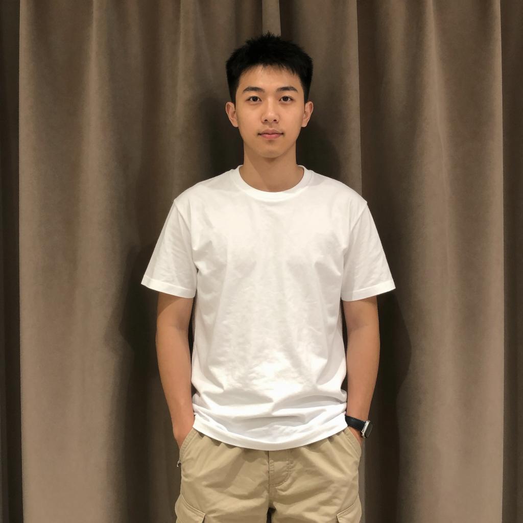 Casual clothing costume, photograph of young Asian man, standing, front view, neutral expression, casual clothing, white t-shirt, beige cargo pants, hands in pockets, black wristwatch, short black hair, brown background curtain, plain backdrop, warm lighting, slight shadow, daytime, realistic style, simple composition, natural light, no additional objects, centered subject