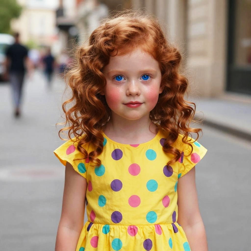 Photograph of a young Caucasian girl with vivid blue eyes and rosy cheeks, standing on a city street. She has curly, bright red hair and wears a yellow dress with colorful polka dots in pink, blue, and purple. The background is slightly blurred, showing an urban setting with pedestrians and buildings. The girl's expression is neutral, and the lighting is natural, highlighting her fair skin and vibrant hair. The street and buildings suggest a daytime city scene.