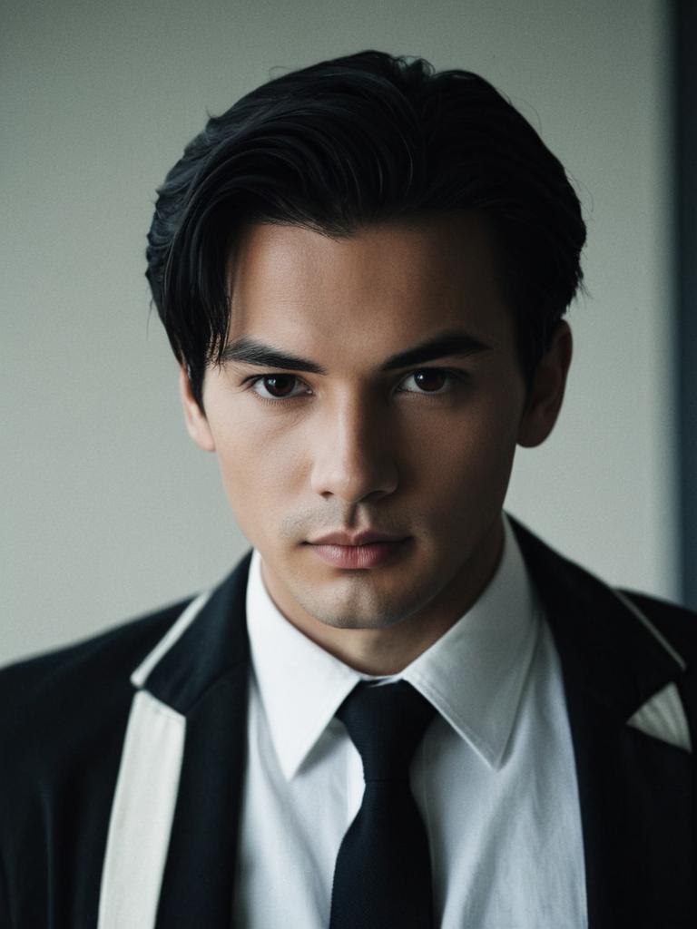 Photograph of a young man with medium skin tone and dark, neatly combed hair. He has a serious expression and dark brown eyes. He is wearing a black suit with white lapels, a white dress shirt, and a black tie. The background is a plain, light grey, creating a contrast with his dark suit. The lighting is soft, highlighting his facial features and the white elements of his attire. The image is focused on his upper body, with a slightly high-contrast, professional portrait style.