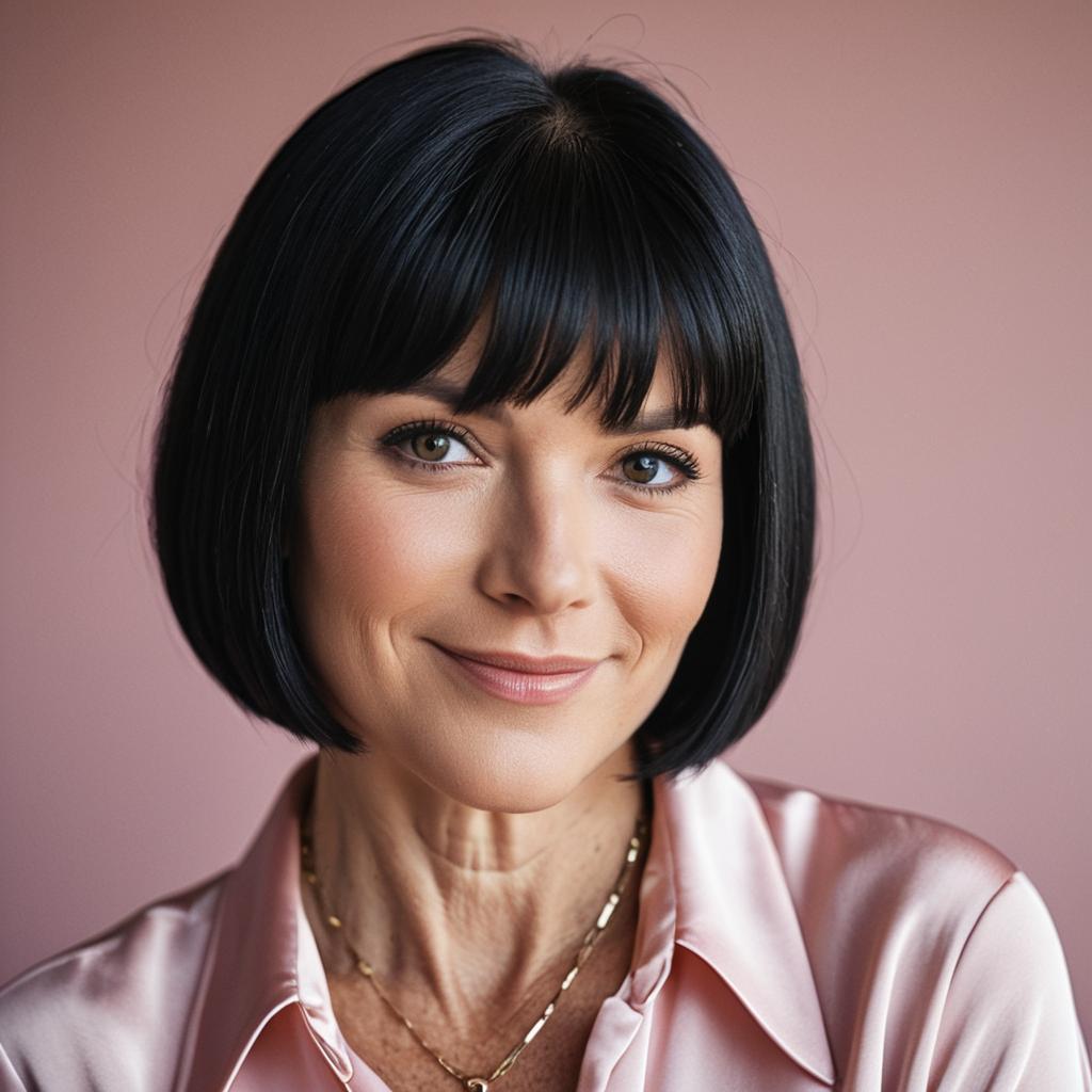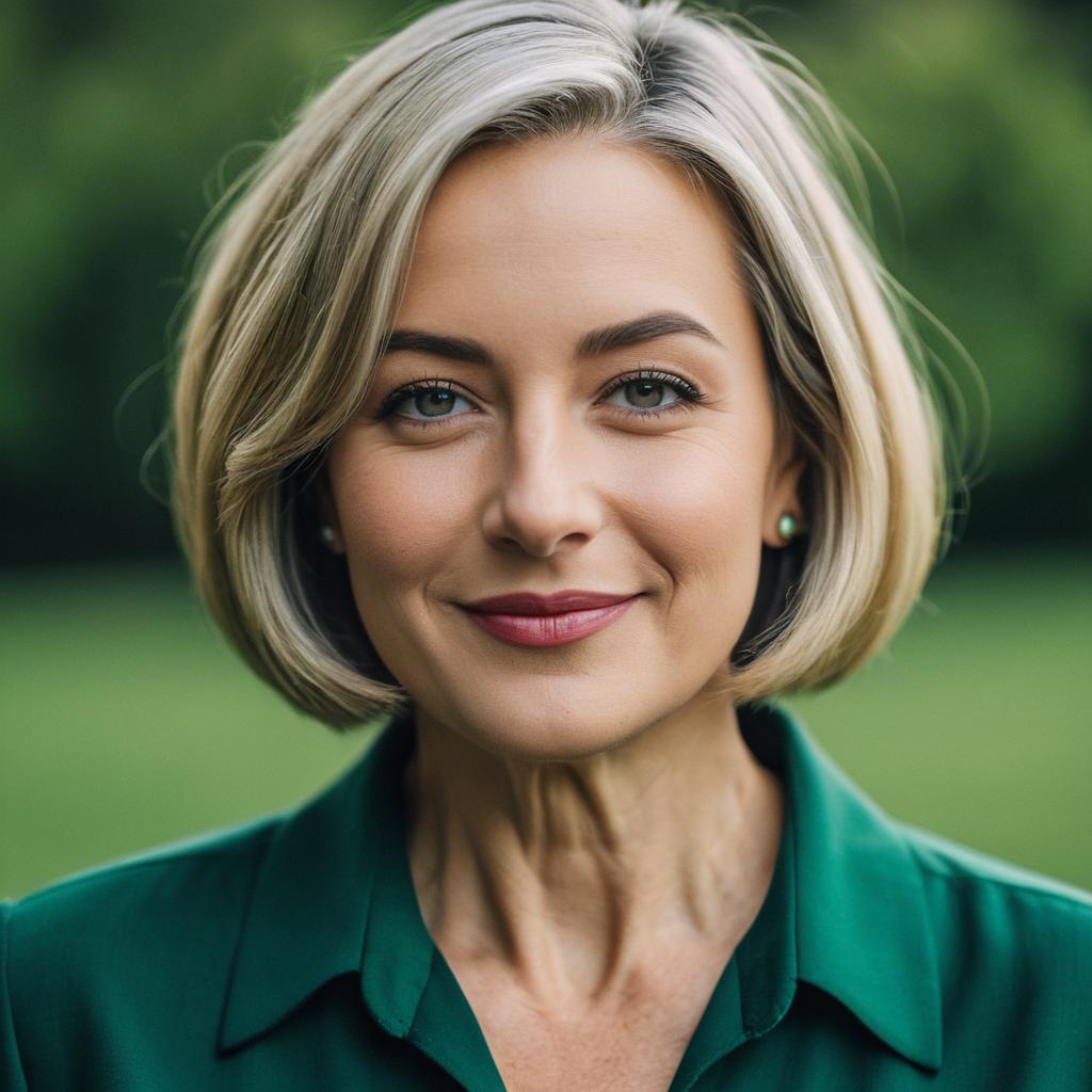 Photorealistic, cinematic lighting, 8K, perfect shading, 50mm lens f/2.8, medium portrait of a young woman with icy blue eyes and platinum blonde pixie cut. She has an enigmatic smile and wears a sleek black turtleneck. Visible from the chest up, with a natural blurred background.