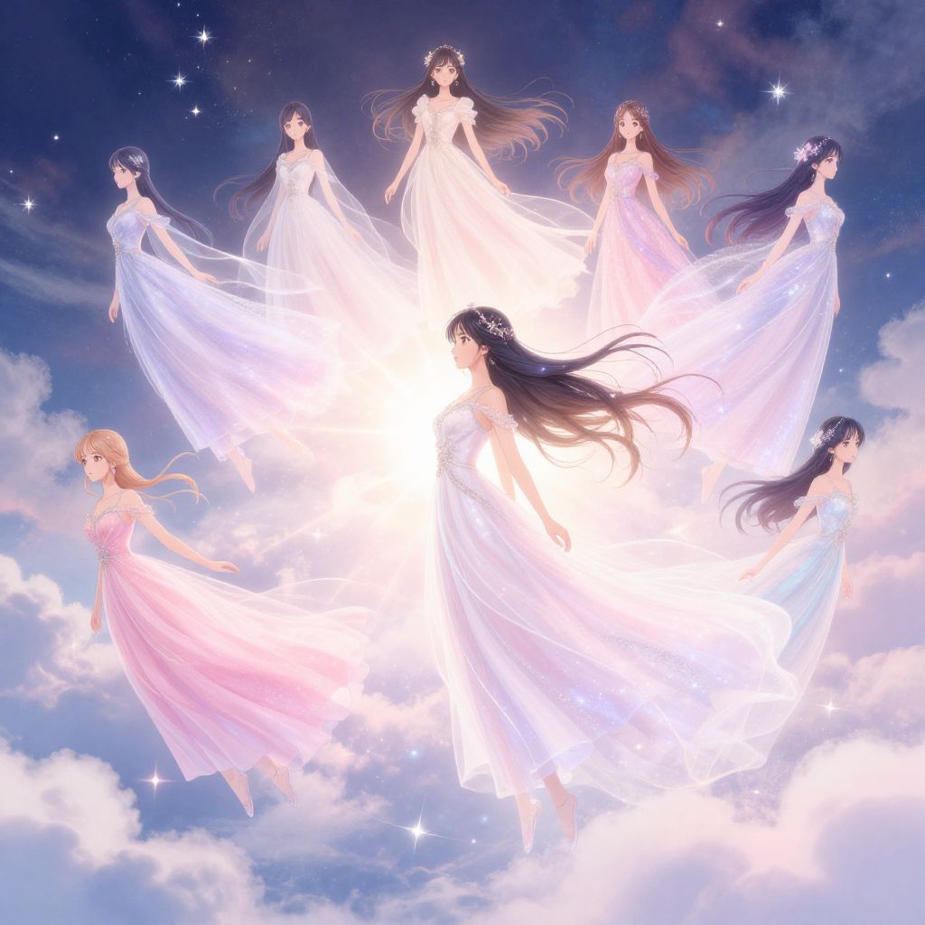 Digital anime artwork of seven ethereal women in flowing white and pink dresses, floating against a bright, starry sky.