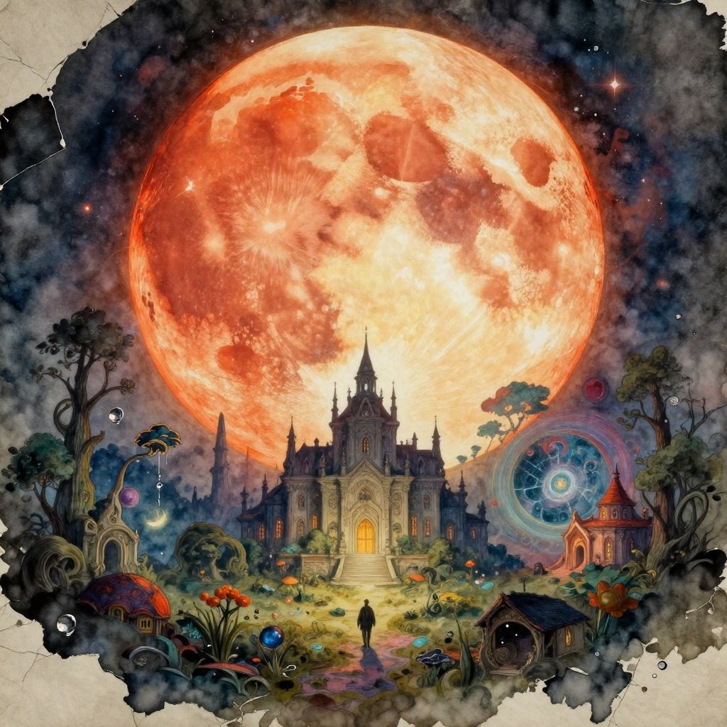 This digital painting features a fantastical scene with a massive, glowing red moon dominating the sky, illuminating a gothic castle at the center. The castle has intricate spires and an arched entrance, with a small figure approaching it. The foreground includes whimsical elements like glowing orbs, tiny houses, and colorful flowers. The background has dark, swirling clouds and a circular, blue, glowing portal to the right. The overall style is vibrant and surreal, with rich colors and detailed textures, evoking a magical, otherworldly atmosphere. The image has a watercolor-like border with visible edges.