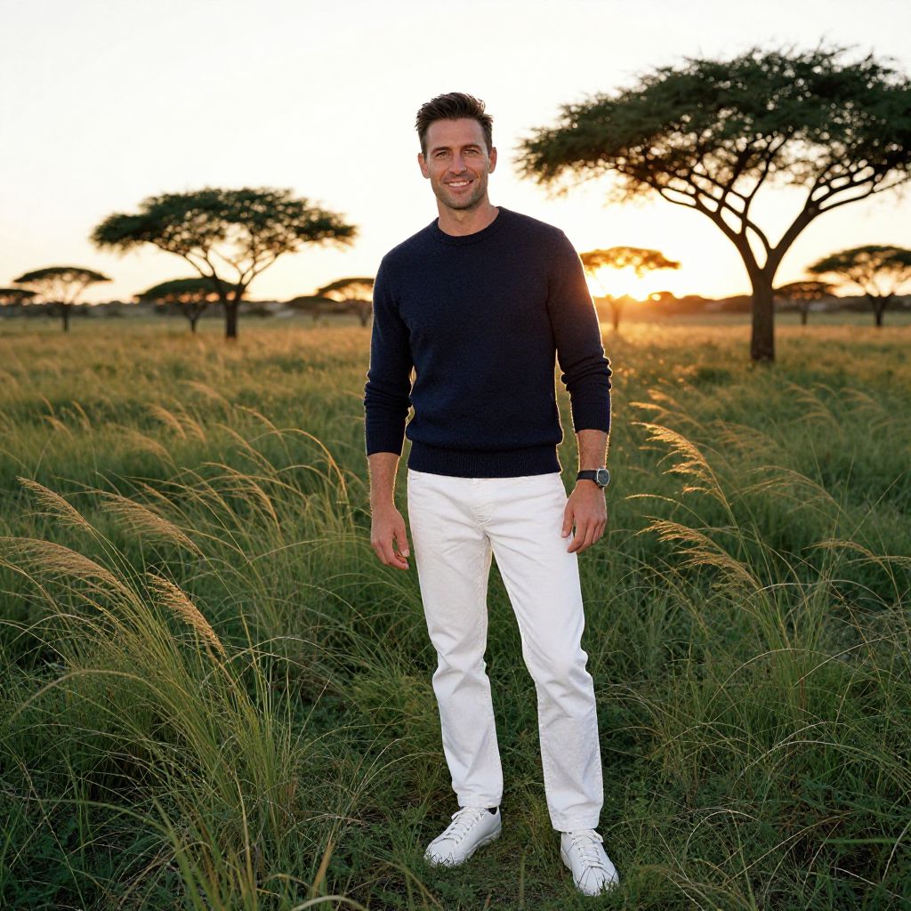 A man, navy crew neck sweater, lightweight merino wool, slim-fit white denim, white sneakers, modern casual look, lush green savannah, golden grasses swaying, acacia trees silhouetted at sunset, AgfaColor film, relaxed smile, warm and inviting expression. Man has masculine face and piercing eyes