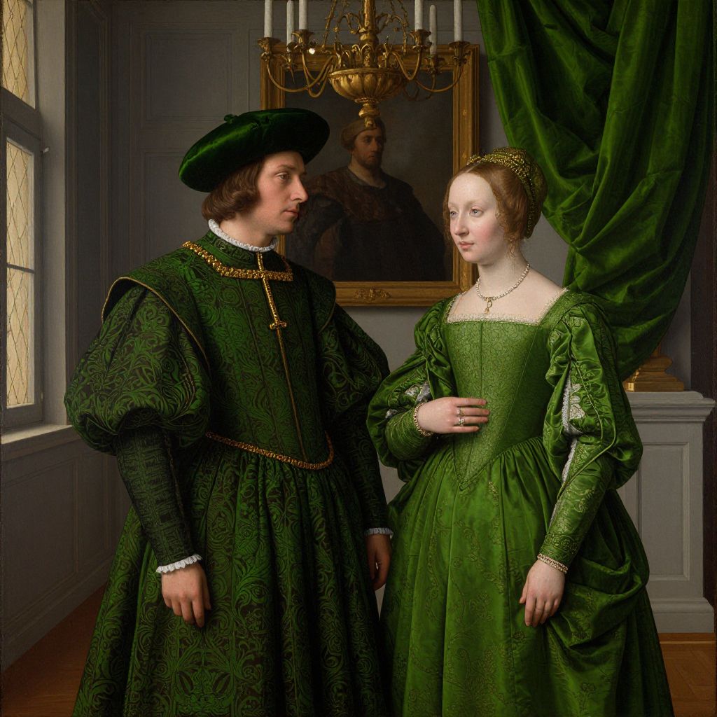 The image depicts a classical art painting, likely inspired by Jan Van Eyck, featuring a married couple in a renaissance setting. The man, dressed in a dark green robe with intricate patterns and a large, dark green hat, stands to the left, while the woman, adorned in a vibrant green dress with a matching headpiece, stands to the right. The room is richly decorated with a chandelier hanging from the ceiling, a framed portrait on the wall, and a green curtain in the background. The couple's attire and the room's decor suggest a high social status, with the man's robe featuring gold accents and the woman's dress having a delicate pattern. The painting's ethereal quality is enhanced by the soft lighting and the intricate details, such as the filigree patterns on the man's robe and the woman's headpiece. The overall composition is balanced, with the couple positioned centrally, creating a harmonious visual narrative.