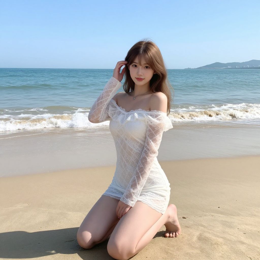 Photograph of a young woman kneeling on a sandy beach with gentle waves in the background. She has light brown hair, a fair complexion, and is wearing an off-shoulder, white lace dress that's slightly sheer. She's touching her hair with one hand and smiling at the camera. The sky is clear blue, and the ocean is calm with a distant cityscape on the horizon.